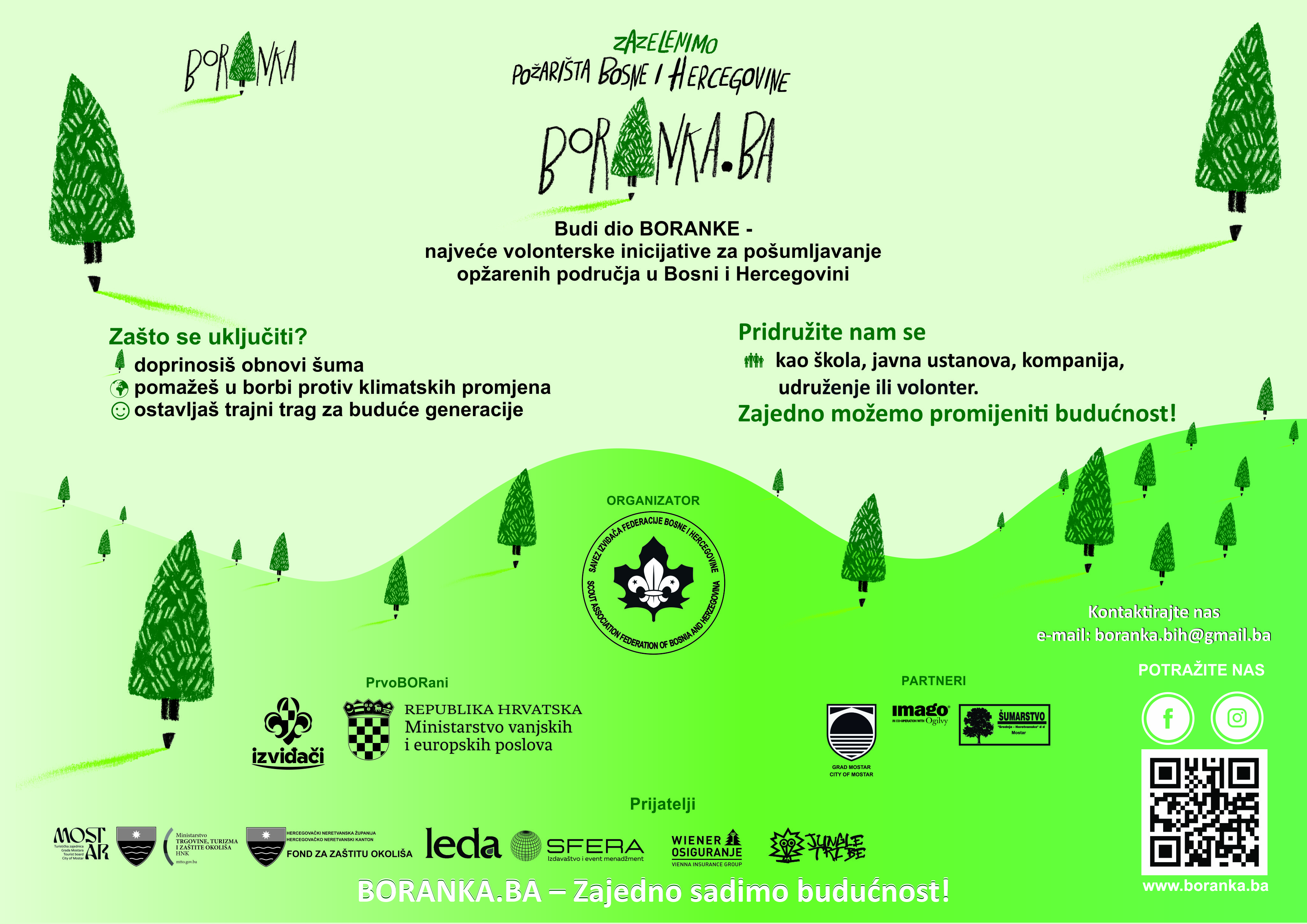 Objavljeno: 17.10.2025Ekonomski fakultet obavještava studente i nastavno osoblje da Savez izviđača Federacije Bosne i Hercegovine realizira projekat BORANKA.BA, najveću volontersku akciju pošumljavanja opožarenih područja u Bosni i Hercegovini.